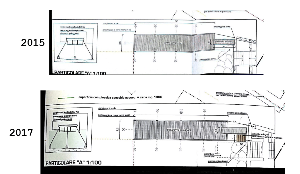 Sulla scia dell’articolo di ieri vi mostro i progetti presentati in Comune, entrambi approvati dalla Commissione Paesaggistica Comunale, soltanto che il primo del 2015 si chiamava “pontile” e non ha beneficiato delle ultime variazioni di legge che permettono paesaggistiche più facili, ovvero semplificate o senza (a seconda dei casi), mentre il secondo progetto del 2017, che si chiama “piattaforma”, è tutta un’altra storia. Il primo non ha mai avuto l’approvazione da parte della Soprintendenza, mentre il secondo si.