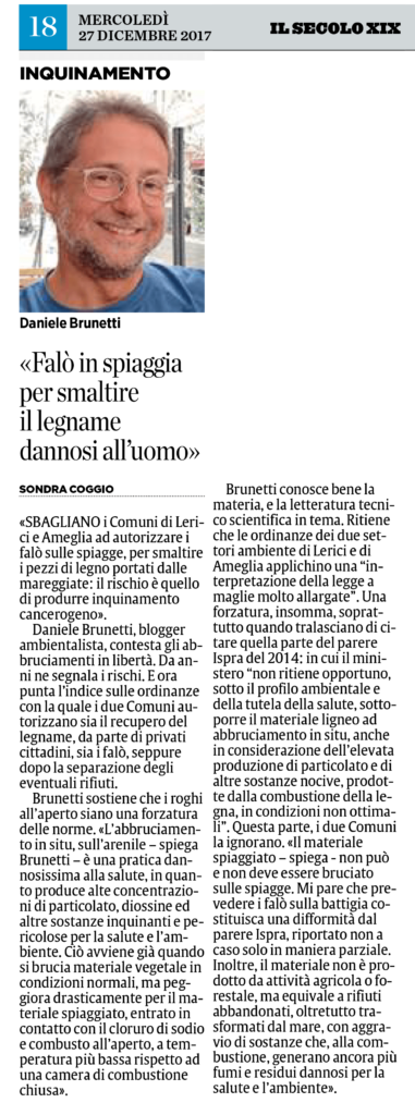 Detto ciò, appare del tutto assurdo che si continui a praticare la combustione del materiale legnoso (o anche solo vegetale) sulle spiagge, quando periodicamente ci ritroviamo il problema degli accumuli dovuti alle condizioni meteo-marine. Anche in questo caso, viene prima la soluzione facile, liberarsi prima possibile del materiale, invece di pensare a tutelare la nostra salute e l’ambiente. Non solo, questo materiale “naturale”, ha subìto una vera e propria “contaminazione” entrando in contatto con i sali di sodio dell’acqua marina, perciò materiale che combusto genererà una: “(…) “elevata produzione di particolato e di altre sostanze nocive prodotte dalla combustione della legna in condizioni non ottimali.” (…)”. Lo scrive ISPRA nel suo parere dato alla Regione Liguria n.1128 del 09.01.14.