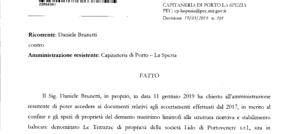 La Commissione per l’Accesso ai Documenti Amministrativi presso il Consiglio dei Ministri, accoglie il ricorso, ma la Capitaneria di Porto spezzina insiste: nessun accesso ad atti, di ogni natura, relativi all’abuso demaniale marittimo presso Le Terrazze a Portovenere (SP). Lo scorso 7 gennaio 2019, il Giudice per le indagini preliminari del Tribunale di La Spezia condanna, con decreto penale n.12/19 … Leggi tutto La Spezia: la Commissione per l’Accesso agli Atti accoglie, la Capitaneria rifiuta la decisione